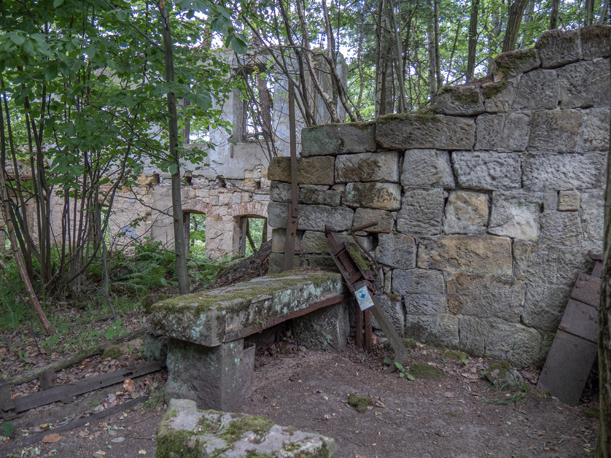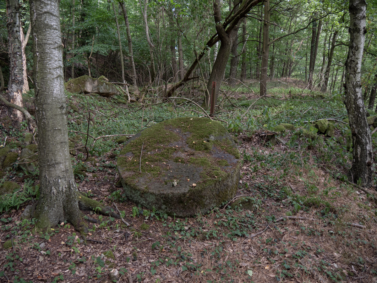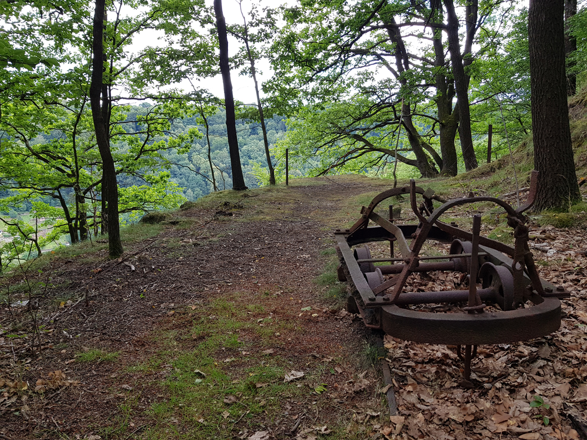 Nach dem Genießen der Aussicht wanderten wir nun auf dem Steinbruchpfad mit seinen Ausstellungsstücken und verschiedene Steinbrüche passierend weiter. An der Ruine des Ateliers Pol Cassal sind wir allerdings vom Steinbruchpfad abgekommen, da wir die Markierung nicht ausreichend beachtet haben. So sind wir weiter oben an der Abbruchkante gelaufen und am oberen Ende der Himmelsleiter herausgekommen. Schade, sollen doch auf dem letzten Wegestück des Steinbruchpfades auch viele Mühlsteine zu sehen sein. Naja, ist auch nicht so schlimm, wir können ja nochmal einen Versuch starten.
