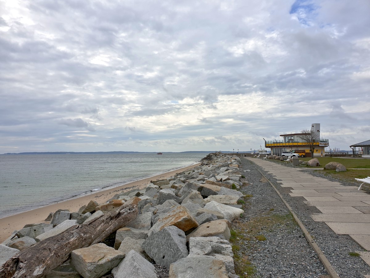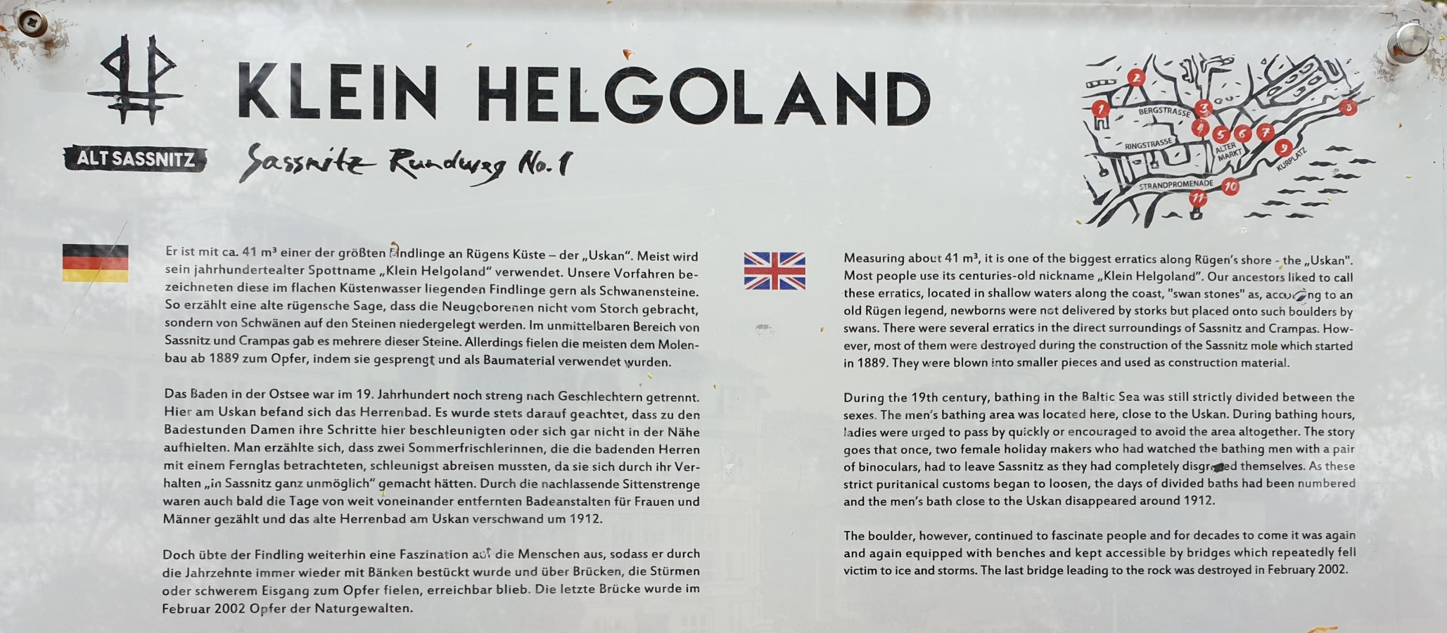 Start war für uns im Parkhaus am Stadthafen. Danach ging es einfach an der Küste entlang der Strandpromenade weiter. Nach dem Passieren der leider nicht mehr betretbaren Seebrücke erreichten wir den Kurplatz mit der markanten Kurmuschel von Ulrich Müther. Vorbei an dem Findling „Klein Helgoland“ gelangt man zum Beginn des Steinstrandes an der Steilküste. Ihm folgten wir nun weiter bis zum Aufstieg an der Piratenschlucht. Eine Treppe brachte uns auf den Hochuferweg. Über die Weddingstraße und Altsassnitz ging es wieder zum Ausgangspunkt.