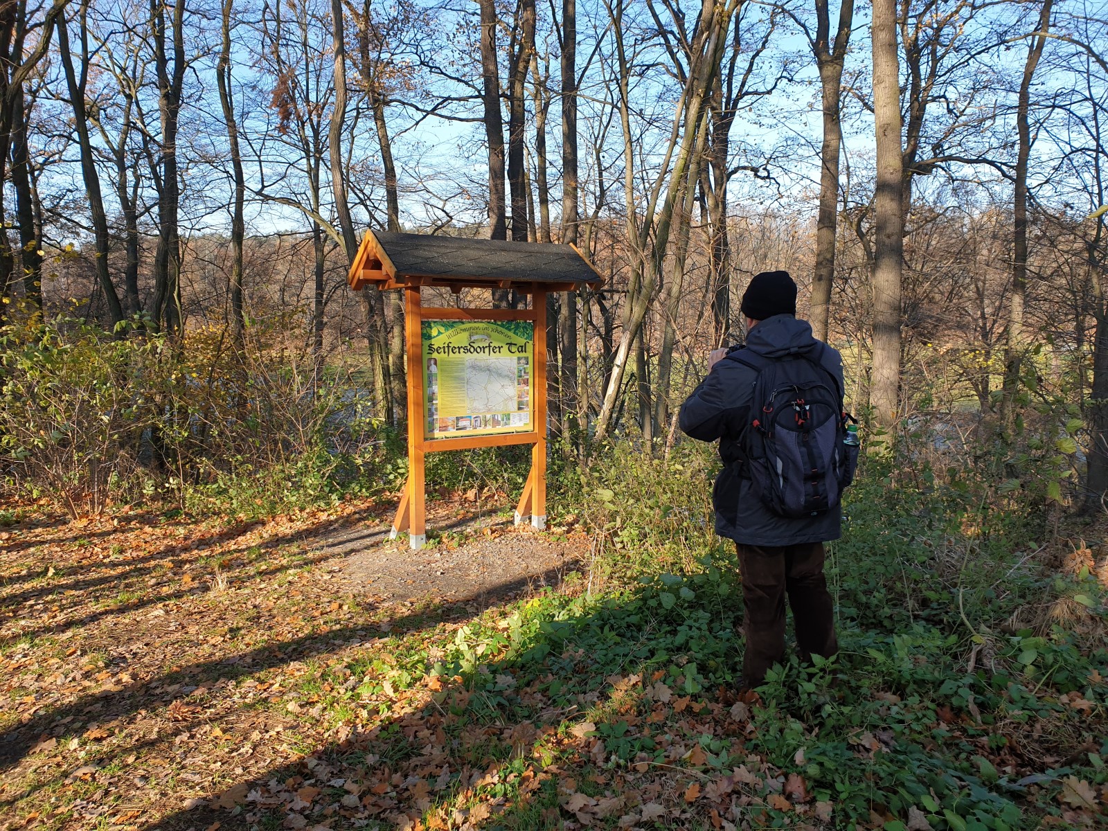 Vom Schlosspark Hermsdorf geht es mit der Markierung Roter Strich vorbei an der Jägerklause zum Hebammenstein und Schmerlenteich. Der Weg steigt etwas an zu einer großen Linde mit einer Aussichtsbank. Kurz darauf wird der markierte Weg nach links verlassen. Ein Wirtschaftsweg bringt uns hinüber nach Grünberg. Hier folgt man der ersten Abzweigung zur Lausaer Straße und zum Eingang des Seifersdorfer Tales.