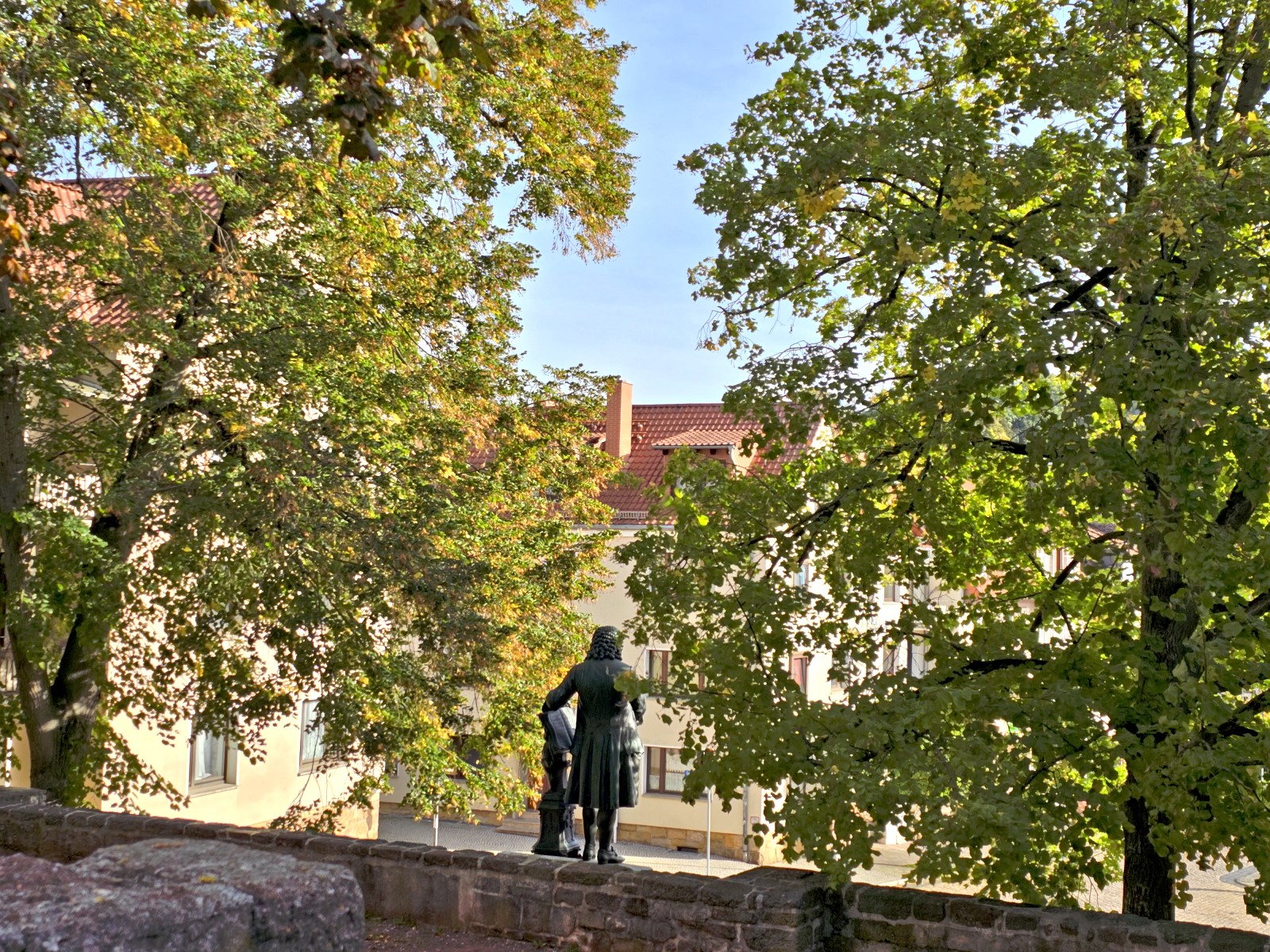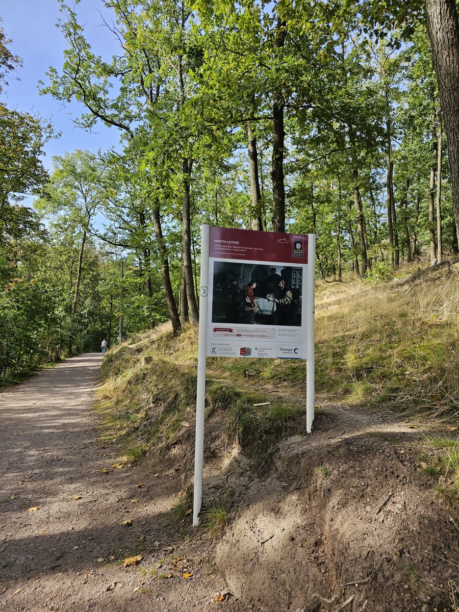 Start war für uns an der „Alten Brauerei“ in der Wartburgallee. Hier befindet sich ein öffentlicher Parkplatz. Vorbei am Ernst Abbe Gymnasium ging es weiter zum Frauenplan mit dem Bachdenkmal und dem Bachhaus. Weiter aufsteigend wurde die Domstraße und entlang der Burgstraße das Waldgebiet kurz vor der ehemaligen Eselstation erreicht. Hier trifft man auf den Luthererlebnispfad, der über den Schlossberg bis zur Eselstation führt.