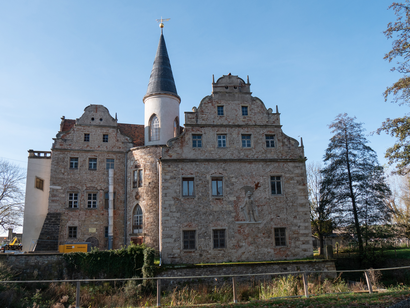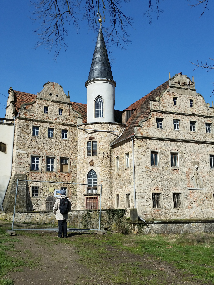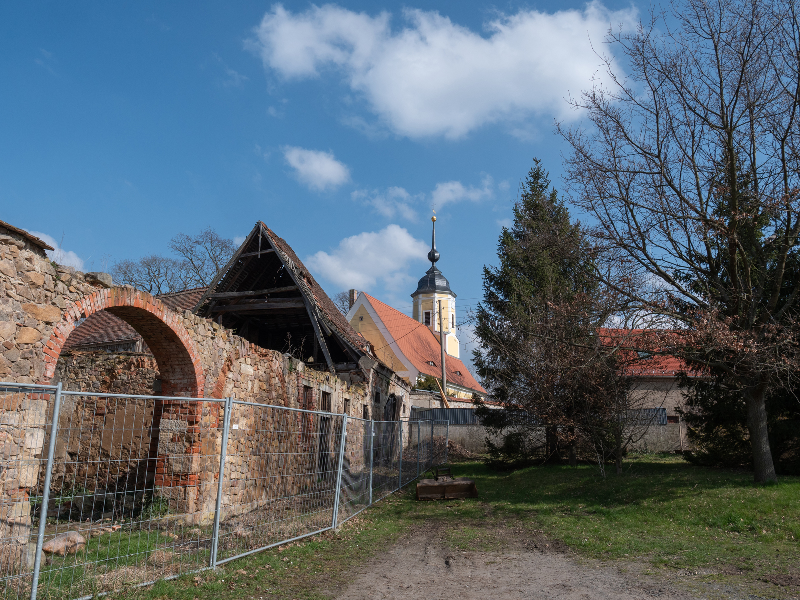Unser aufgezeichneter Spaziergang ist 2 km lang. Start für den Rundweg ist am Parkplatz an der Kirche. Hinter dem Schloss verließen wir den Schlosspark und gingen entlang der Schlossparkmauer mit Blick nach Gröbern und entlang eines Weinberges.