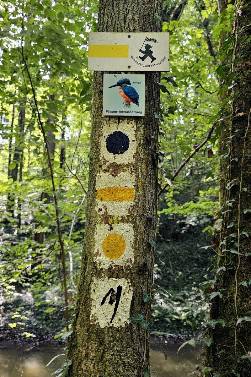 Los ging’s für uns am Wanderparkplatz in der Nähe der alten Pappenfabrik Liebethal und weiter zum Klettergarten im Liebethaler Grund. Der Wesenitzwanderweg wird hier vom DichterMusikerMaler-Weg und vom Malerweg begleitet. Der Malerweg startet an dieser Stelle mit seiner ersten Etappe. Daher hatte ich mir die aufgestellte Tafel am Startpunkt eigentlich informativer vorgestellt …
