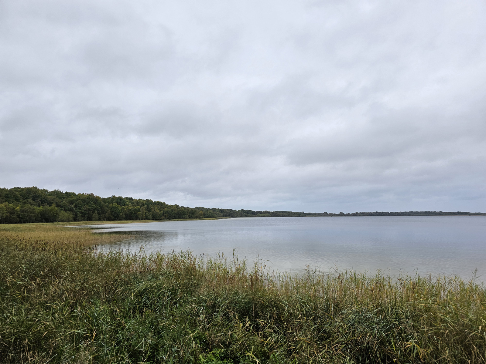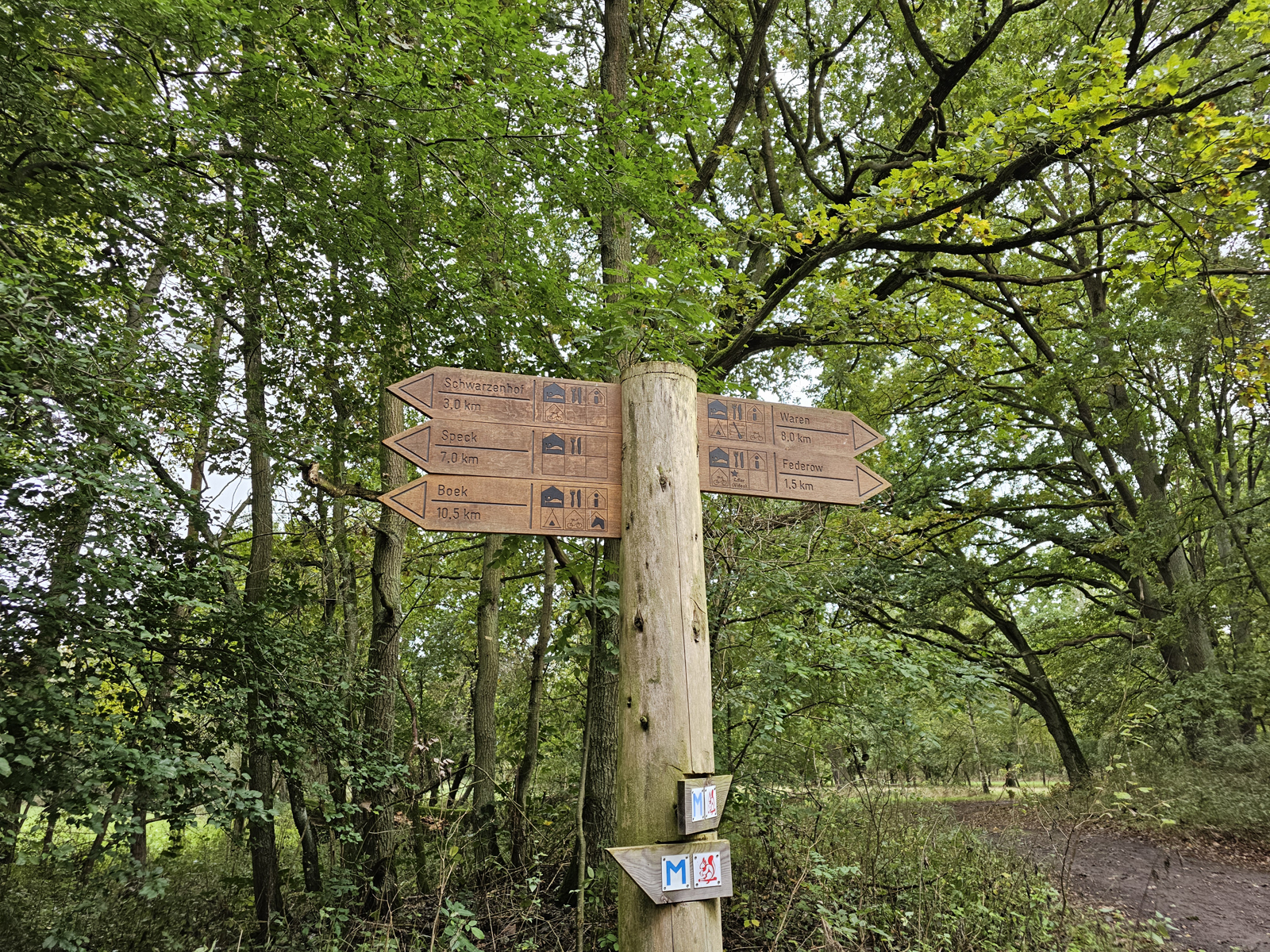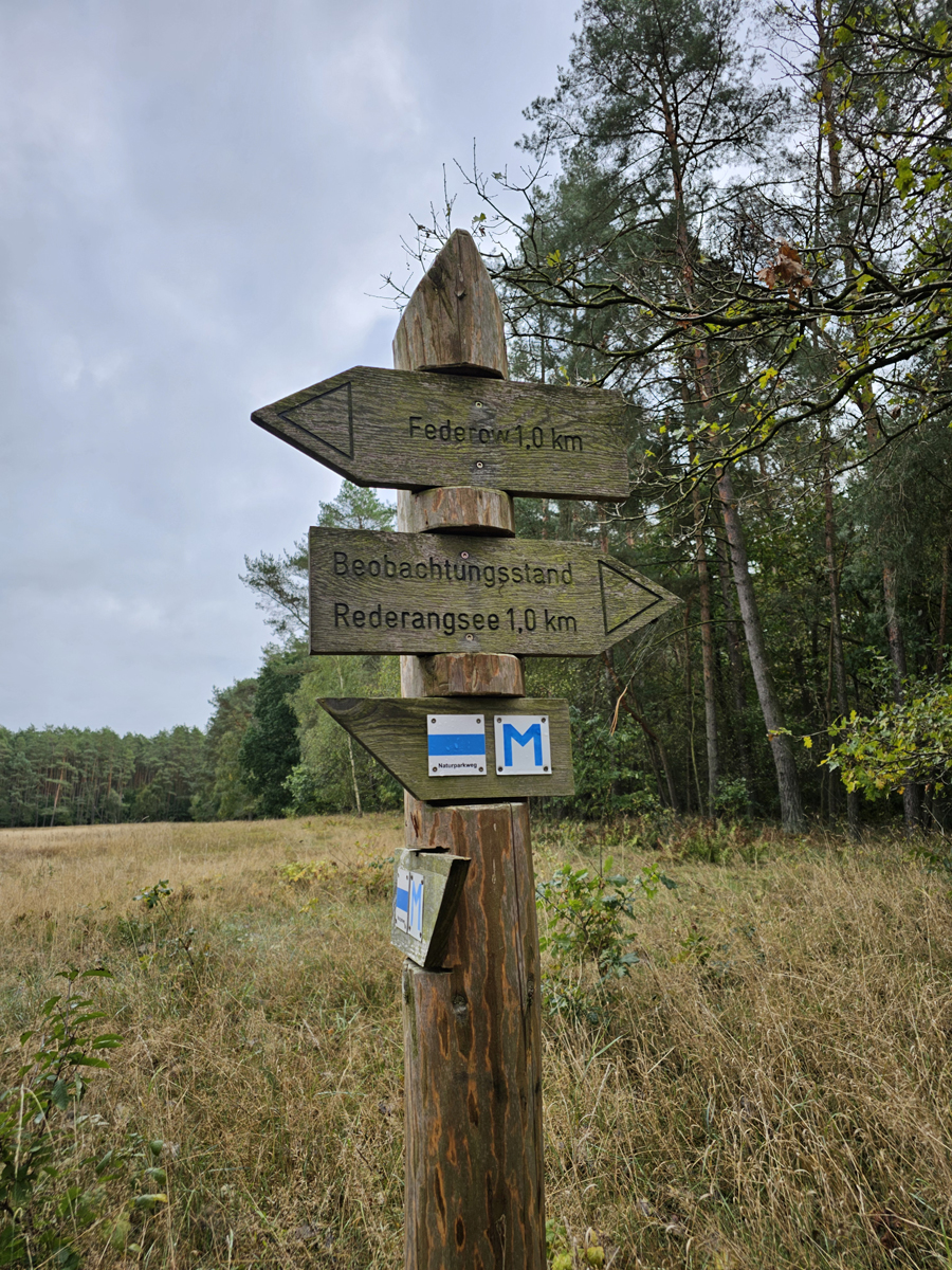 Wir wollten den empfohlenen Rundweg „Rotes Eichhörnchen“ von Federow nach Schwarzenhof wandern. Das Wetter zeigte sich aber zusehends von seiner nassen und ungemütlicheren Seite, sodass wir am Beobachtungsstand am Rederangsee umkehrten. So haben wir zumindest einen kleinen Eindruck von der Landschaft bekommen.