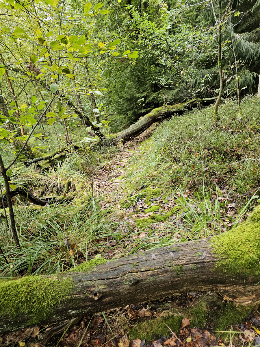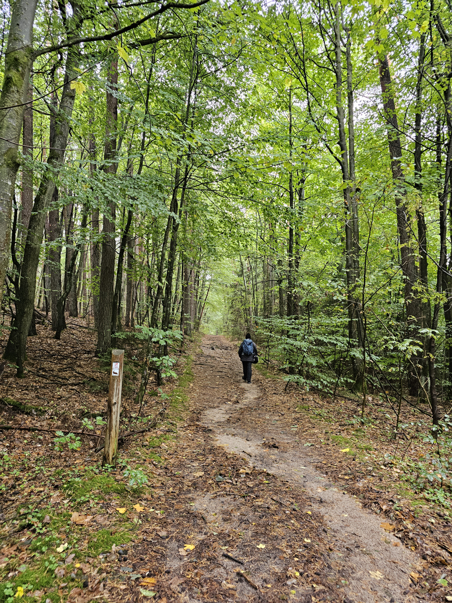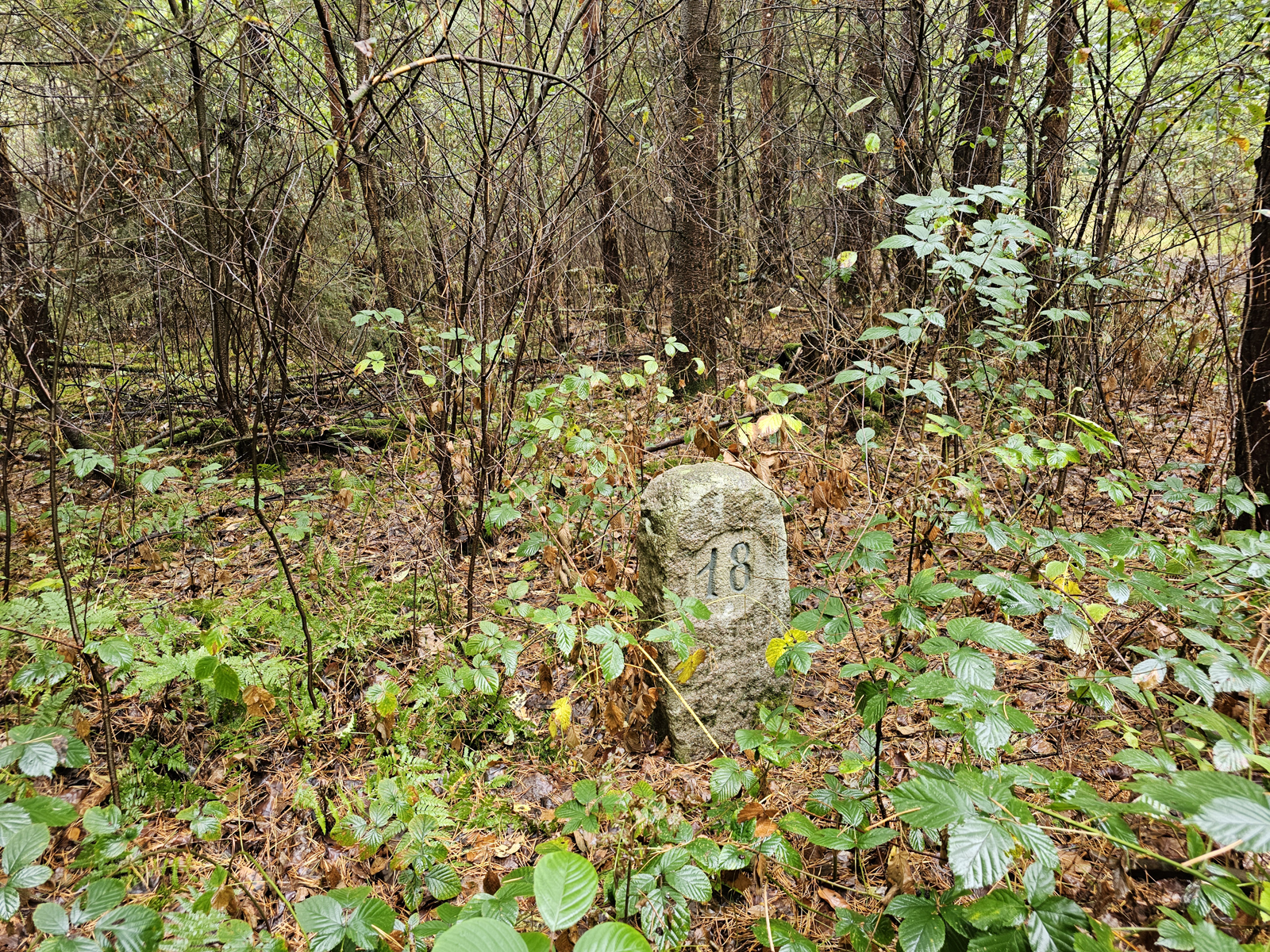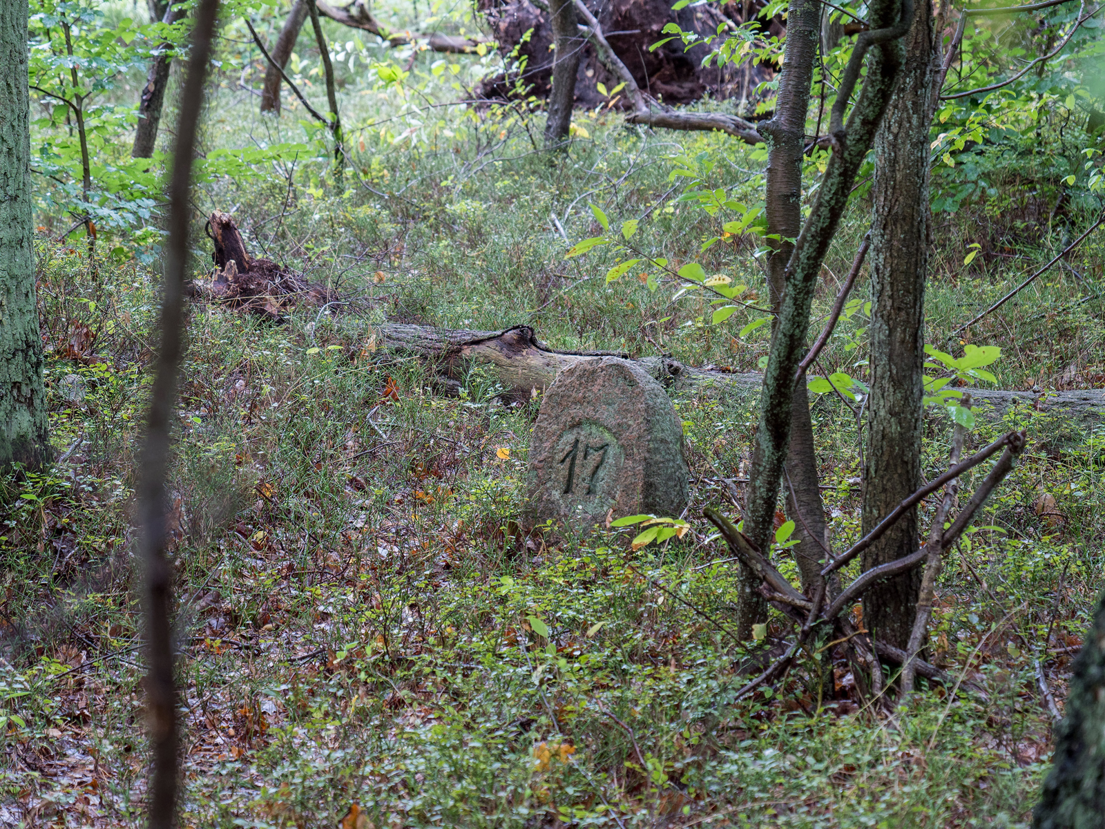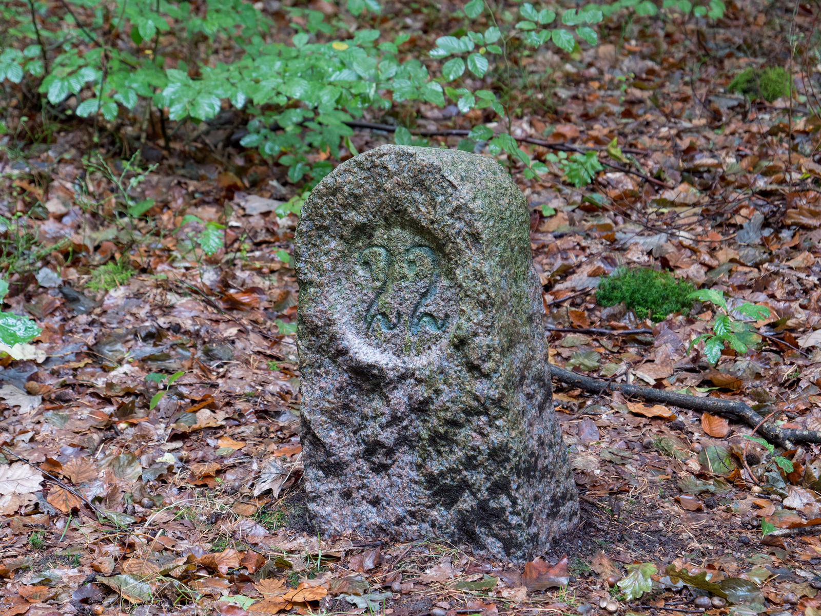 Entlang eines breiten Forstwegs „Am Teufelsbruch“ ging es zu einem Abzweig am Stadtwald Ecktannen. Für den Hinweg wählten wir den rechten Weg. Hier fielen uns sehr viele alte Grenzsteine auf, die alle Nummern trugen, sahen wie Hausnummern aus. Sind das Flurbezeichnungen, Markierung von Quartieren oder Waldeigentümer-Abgrenzungen? Zur Bedeutung der Nummern habe ich leider keine Erklärung gefunden. In so gehäufter Form kommen Grenzsteine bei uns in heimischen Gefilden nicht vor, es ist immer etwas Besonderes, wenn man auf einen stößt und die Gemarkung oder das Rittergut entziffern kann.