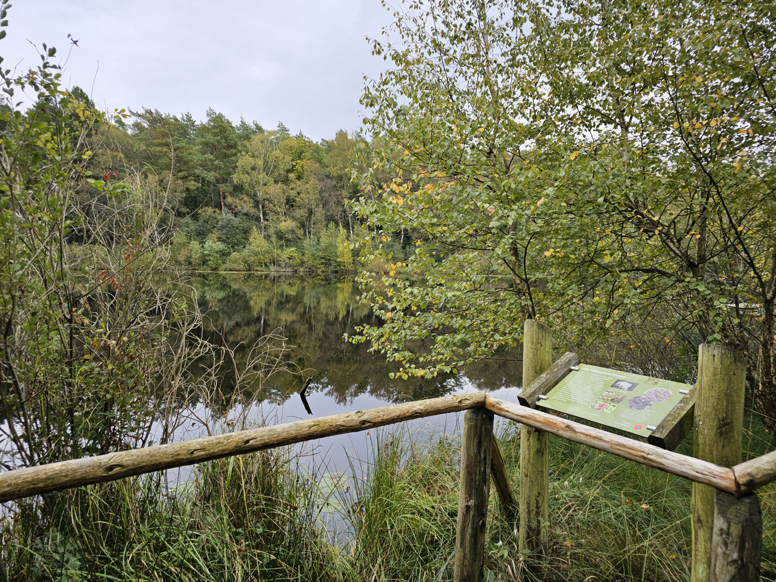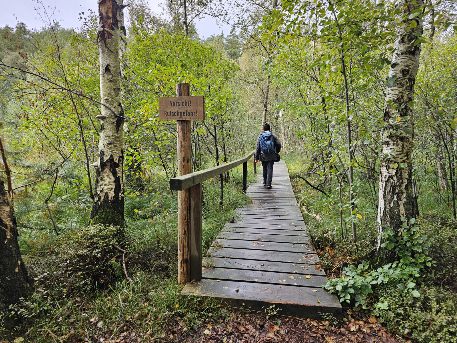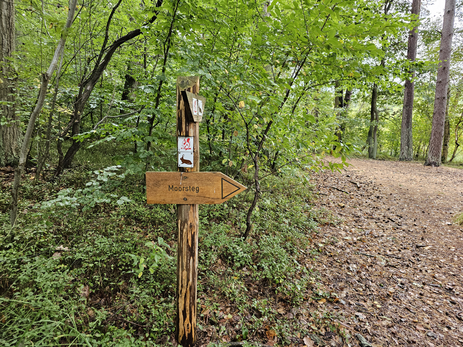 Vorbei am Doktorberg gelangten wir zu einem Rastplatz an den Wienpietschseen. Dort weist ein Wegweiser zum Moorsteg um den Weinpietschsee. Ihm folgten wir. Der Weg ist nach dem ersten Abschnitt des Steges etwas unwegsam. Man sollte diesen Abschnitt etwas weiträumiger umlaufen.