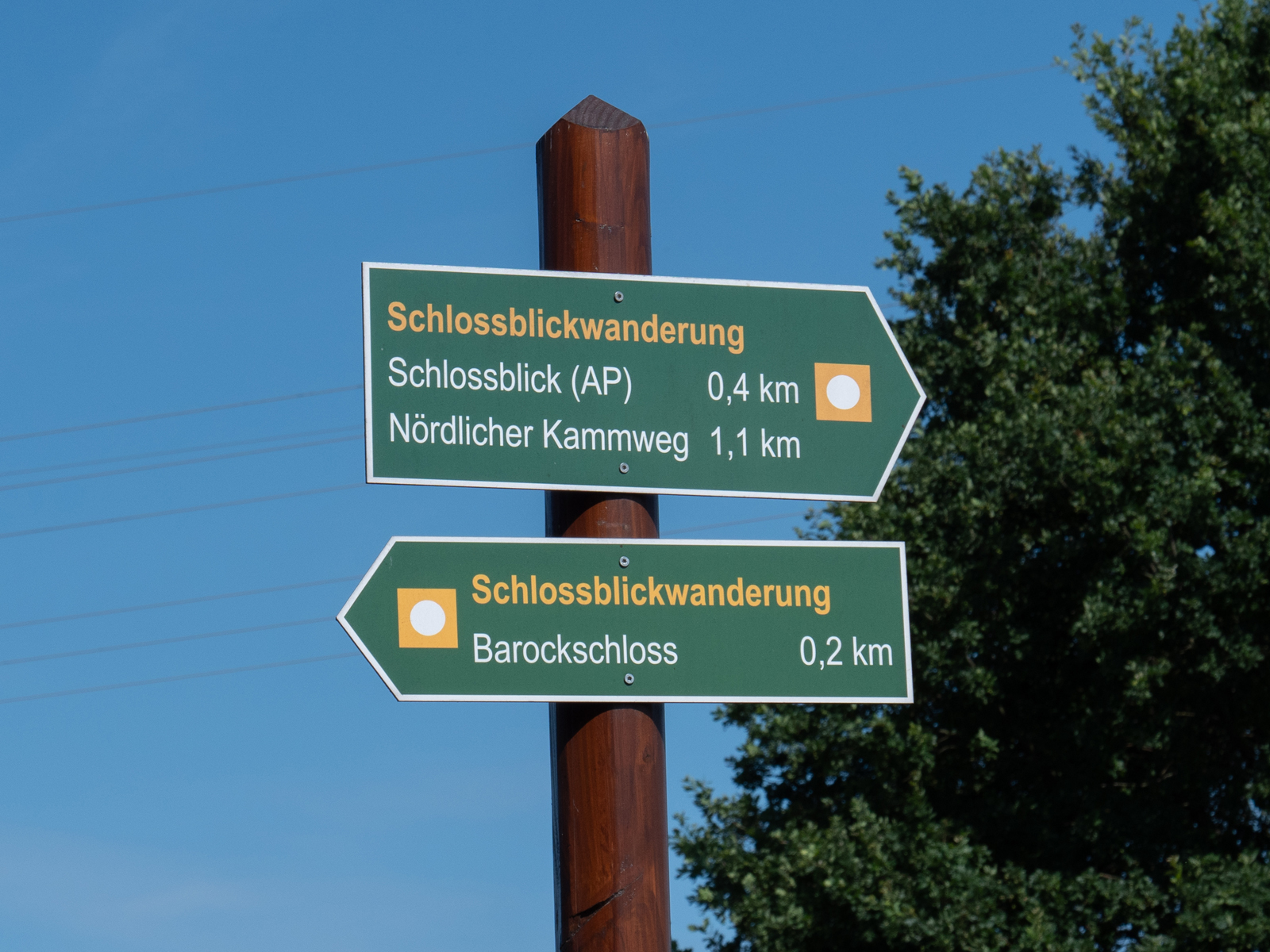 Start war für uns am Parkplatz des Barockschlosses. Die Schlossblickwanderung ist mit dem Wegzeichen „Weißer Punkt auf gelbem Grund“ gut ausgeschildert und nicht zu verfehlen.