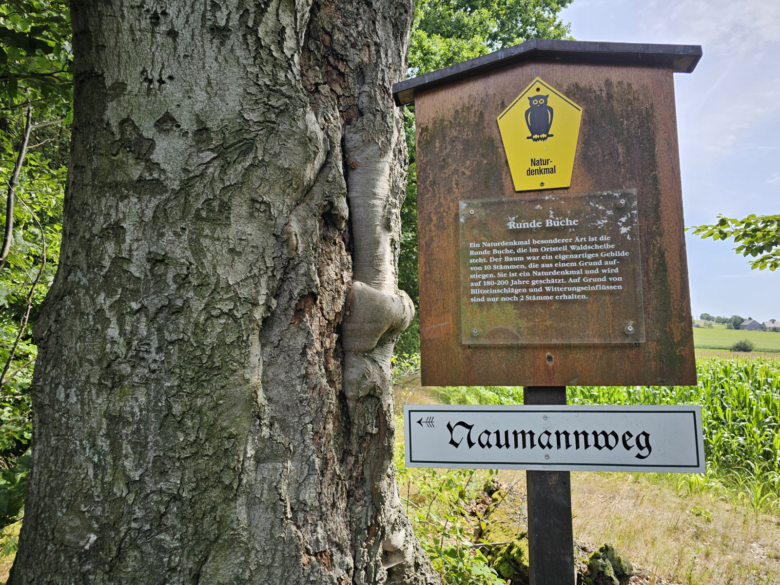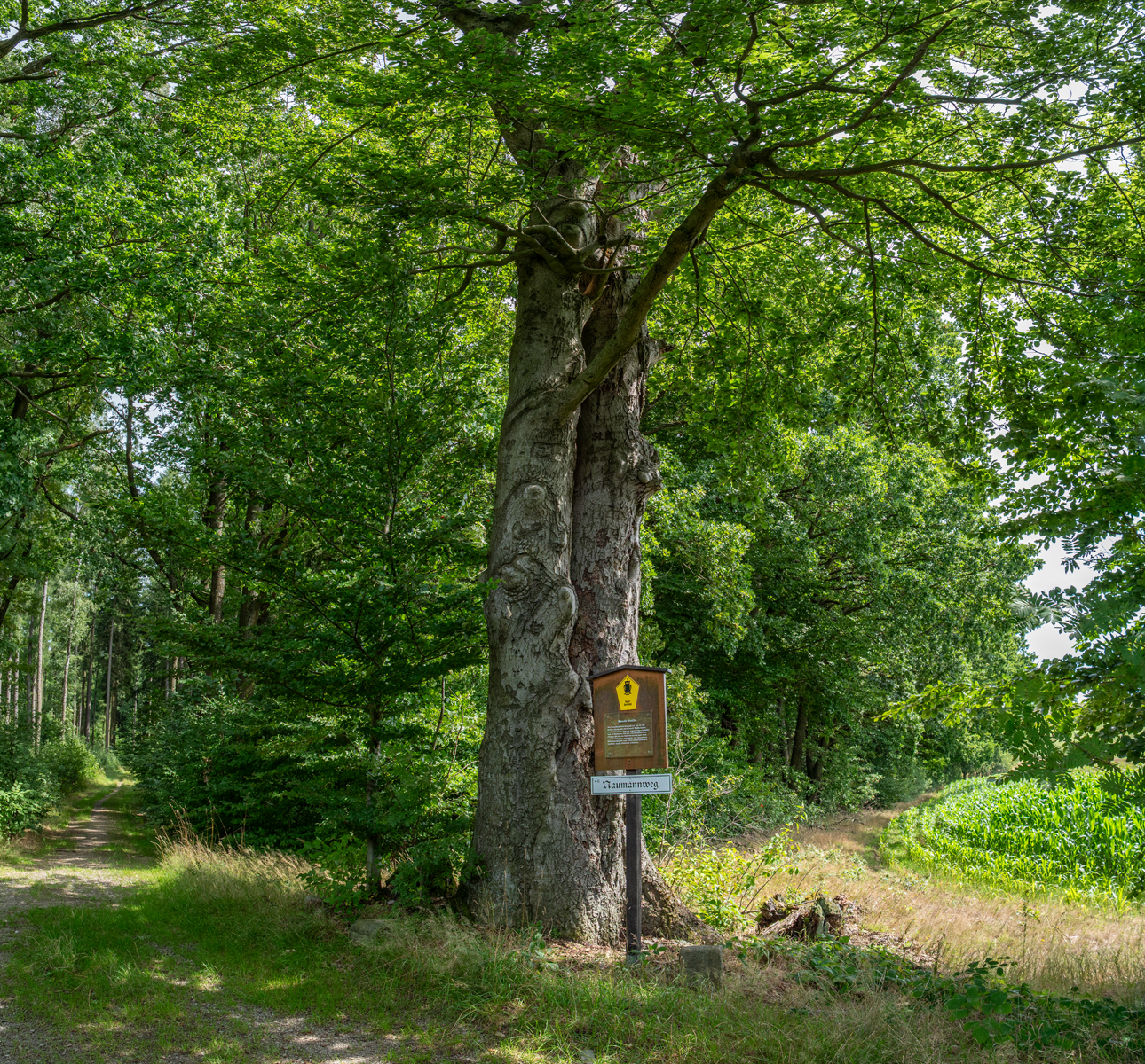 Weiter aufwärts steigend, wurde der „Nördliche Kammweg“ erreicht. Der Wanderweg folgt nun ein Stück dem „Oberlausitzer Ringweg“ (Roter Punkt auf weißem Grund) und macht mit dem Naturdenkmal „Runde Buche“ bekannt.