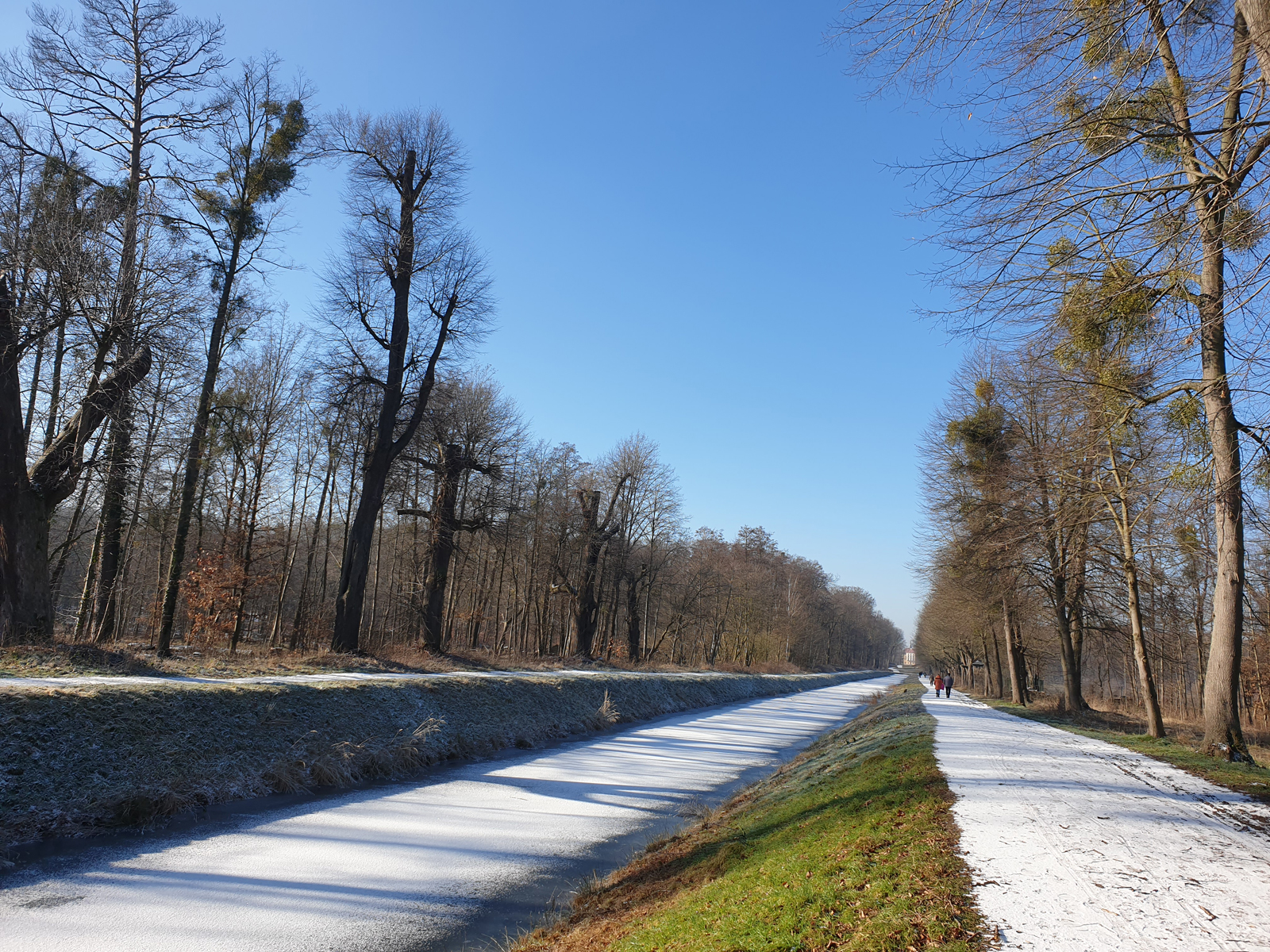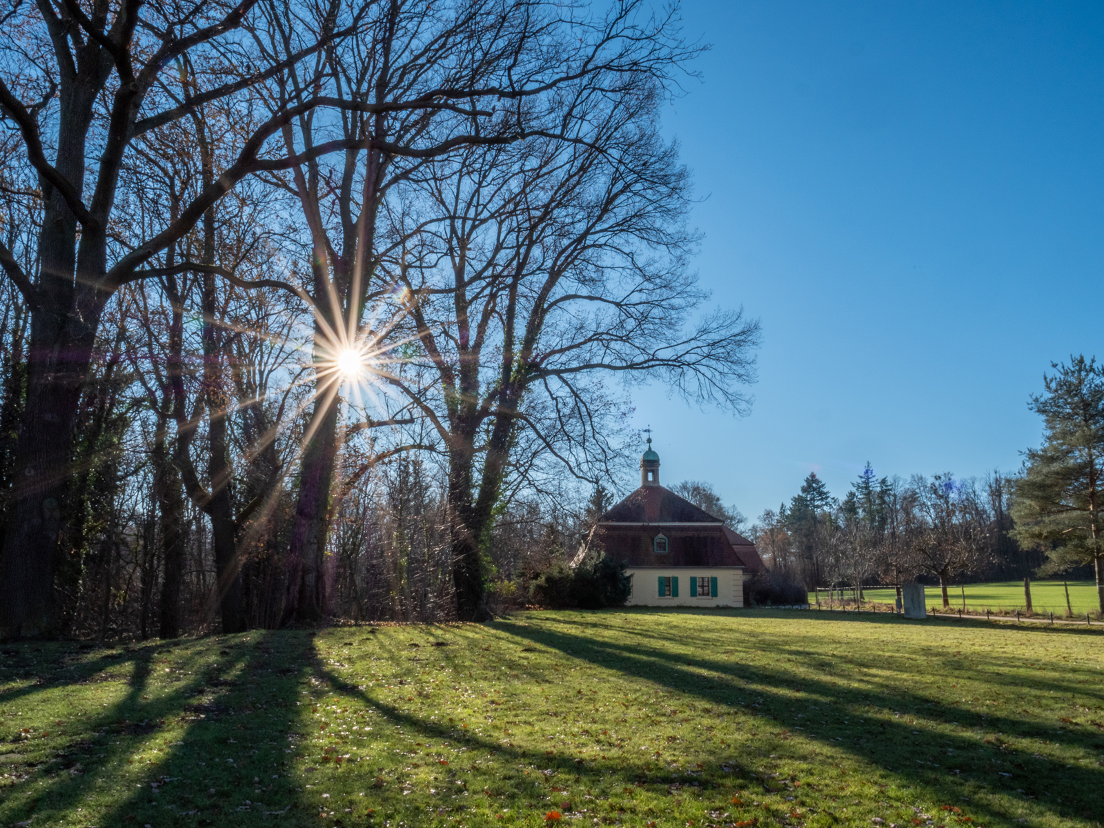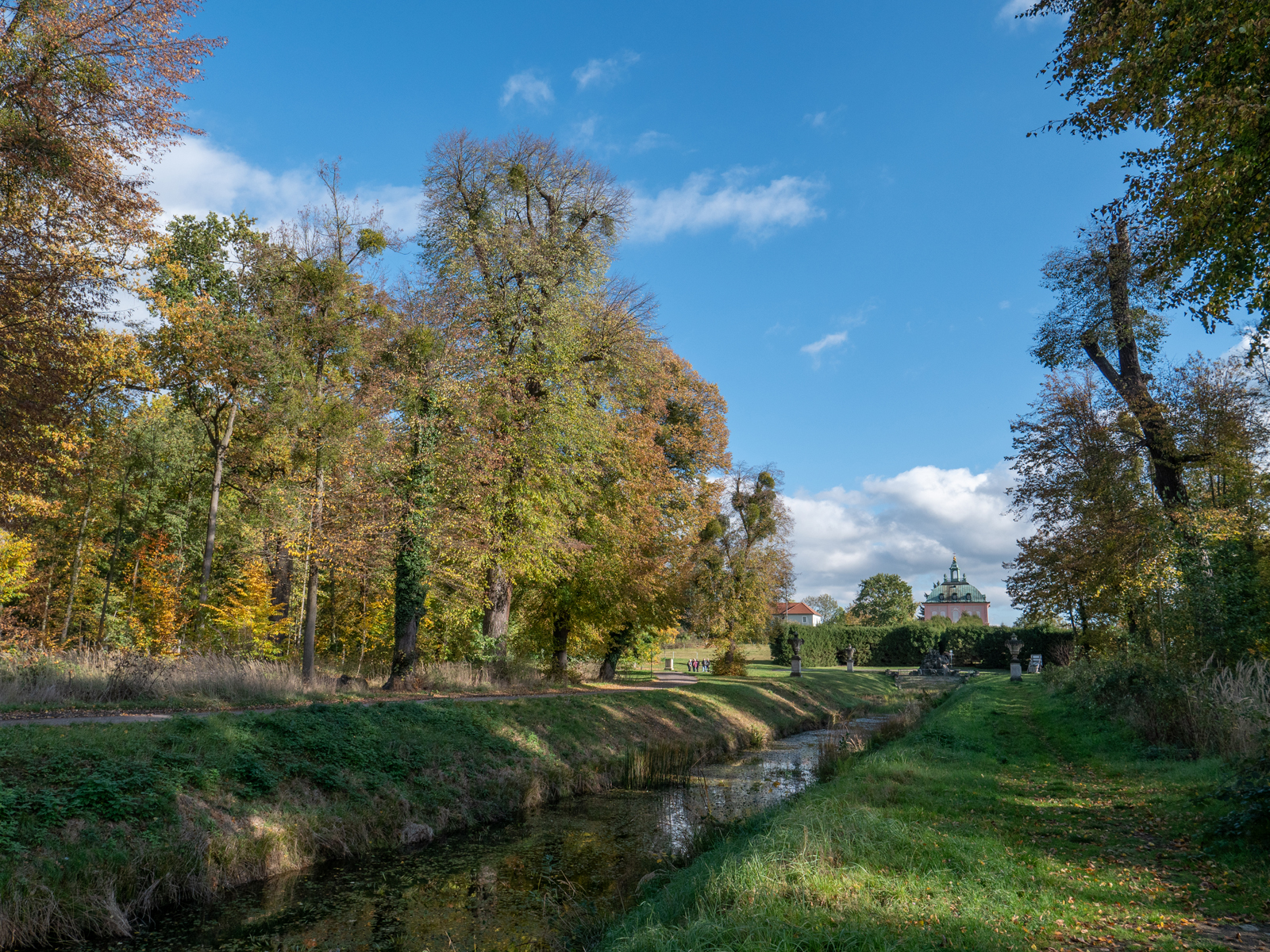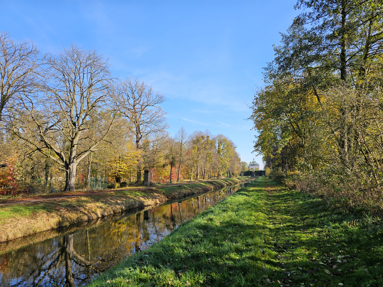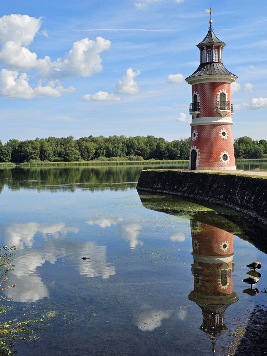 Schöne Blicke ergeben sich auf diesem Teilabschnitt der Wanderung zum Leuchtturm, auf den Kanal und entlang der Sichtachse vom Fasanenschlösschen zum Barockschloss.