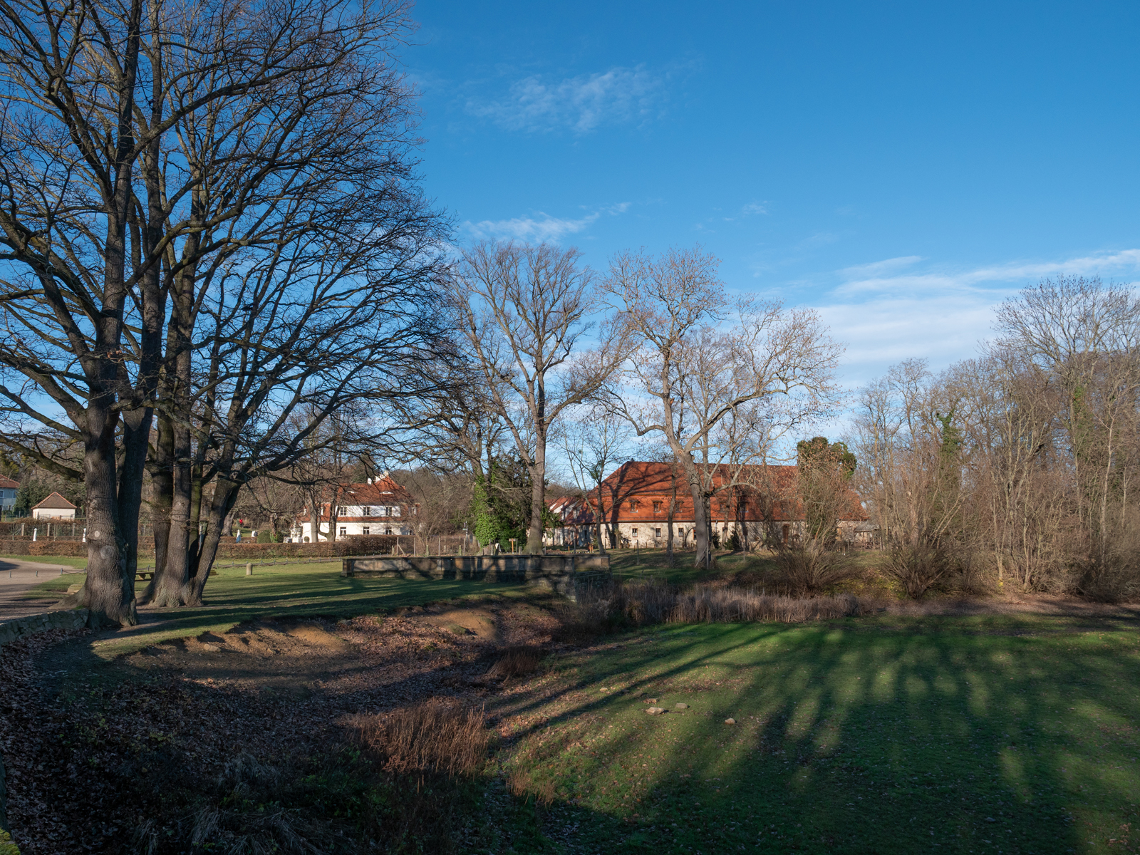 Westlich am Barockschloss vorbeigehend erreichten wir den Damm des Schlosses. Zum Ausgangspunkt der Wanderung ging es entlang der Radeburger Straße und der Kleinen Fasanenstraße.